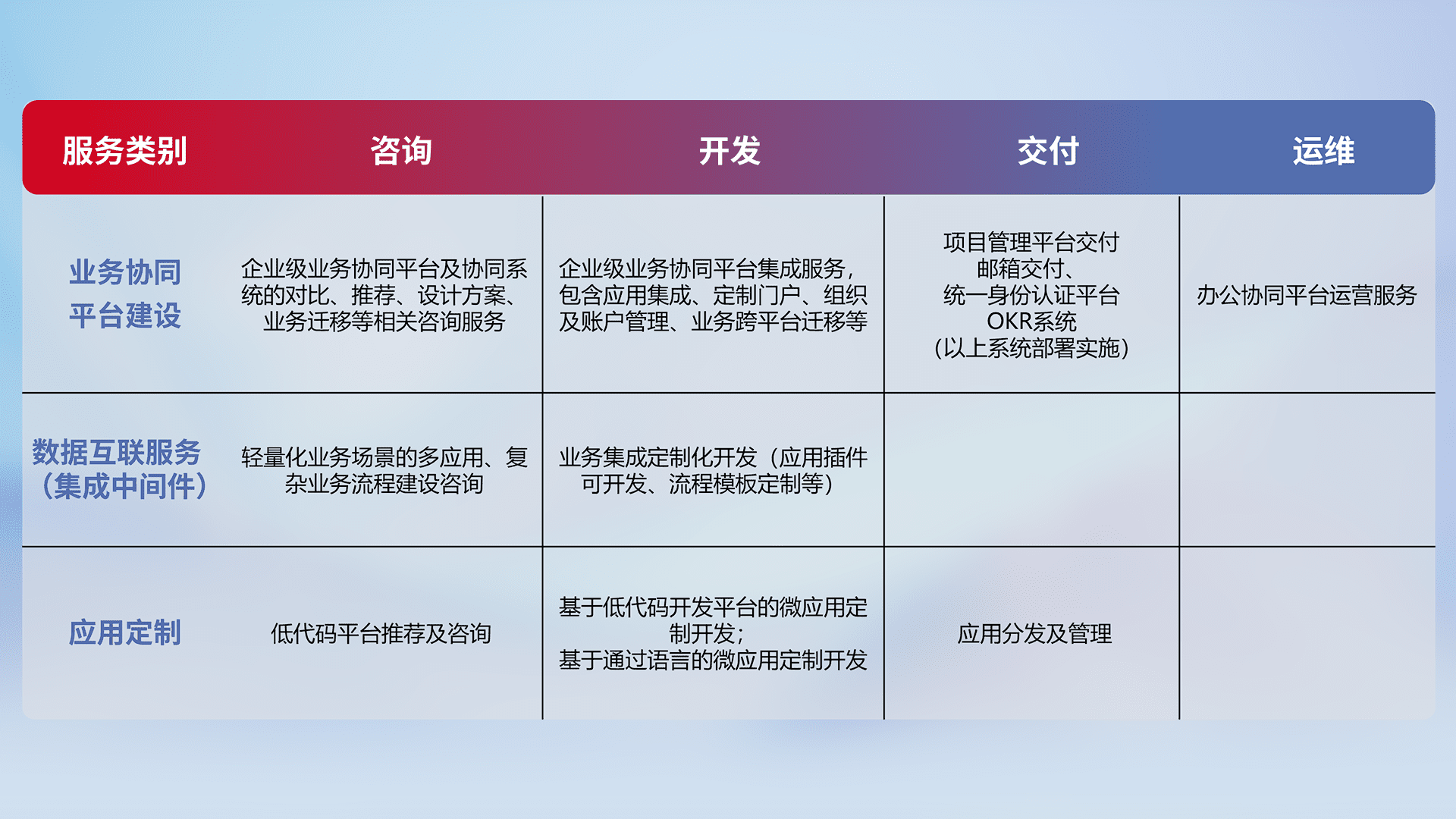 针对钉钉、、企微、、、、IDaas等平台级产品提供产品的规划、、、方案、、交付、、定制化开发等服务,,,,实现如统一协同办公、、智能客户服务、、、混合会议管理、、智能数据查询、、、等业务场景,,,实现数字化转型。。